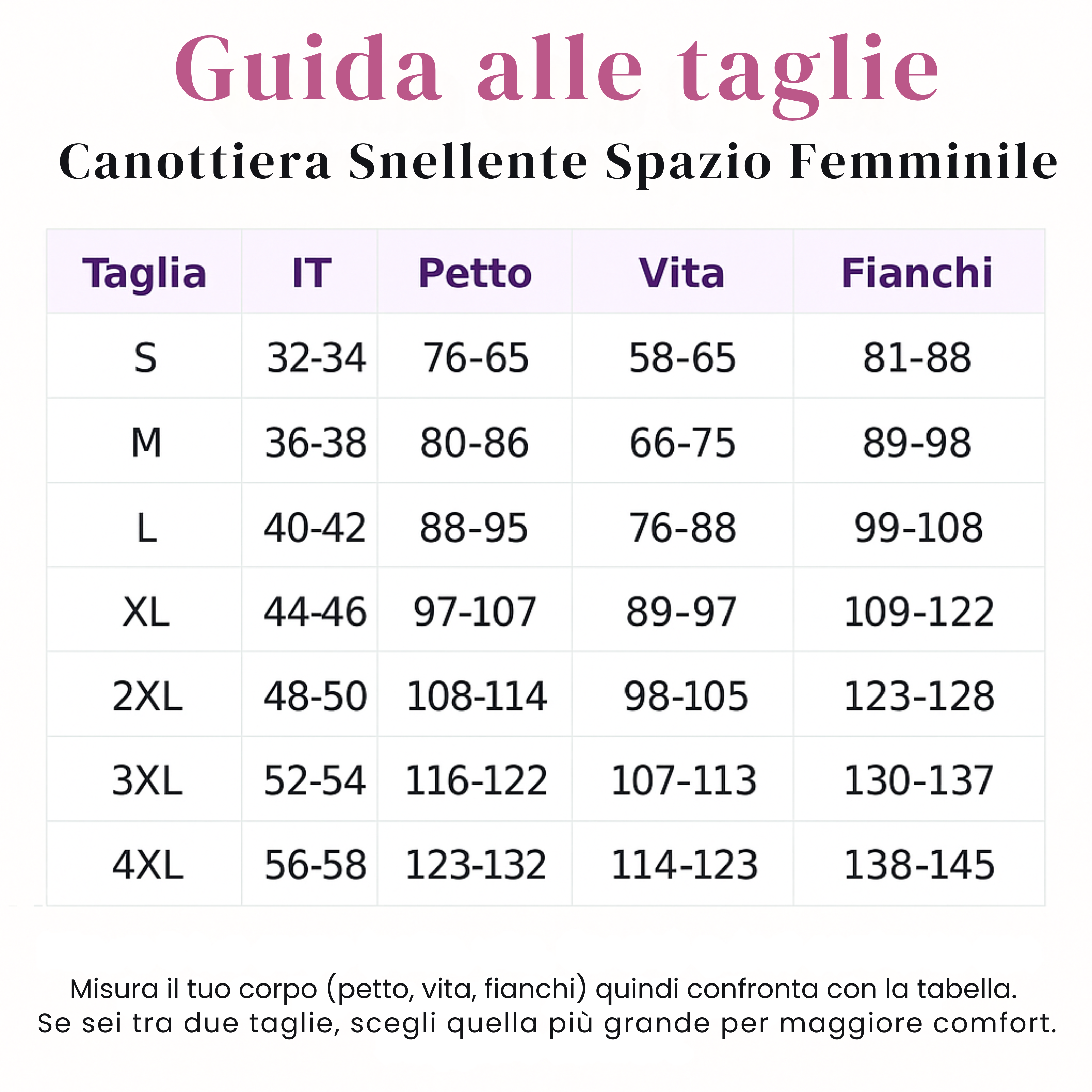 Se sei indecisa tra due taglie, scegli la più piccola per un effetto modellante più deciso, oppure la più grande per un maggiore comfort.